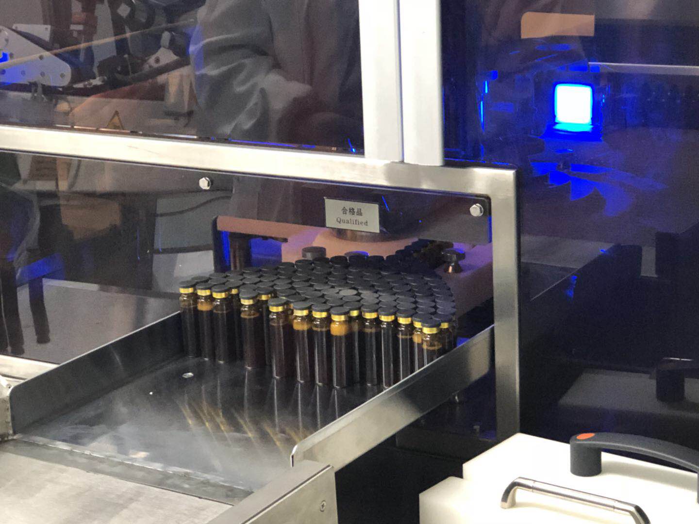 灌裝完成后的產品,經過我們的口服液自動燈檢機進行檢驗剔廢。我們的自動燈檢機設備是對可見異物及封口缺陷等進行自動檢測,并自動分選出合格品和不合格品。整套設備完全實現了自動化檢驗,保證了產品安全、大大節省了人力物力、提高工作效率、降低誤檢率。