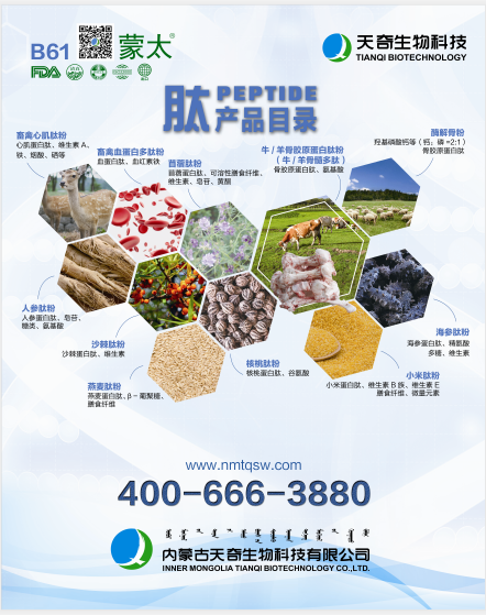 內蒙古天奇生物科技有限公司,組建于2004年,為內蒙古天奇蒙藥集團核心子公司,坐落于美麗的草原明珠——赤峰市。公司依托獨特的地理位置與豐富的動植物資源,利用先進的設備與工藝,堅持“骨肽,我們只做鮮的”產品定位,專注于各類肽原料的生產,加工,定制,銷售。目前公司自主品牌蒙太®旗下已有畜源肽,植物肽等多個品類,十余種產品,在本次會議都將與大家見面。